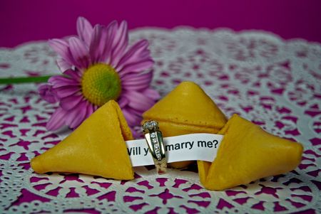 Diamond ring and marriage proposal in fortune cookie.