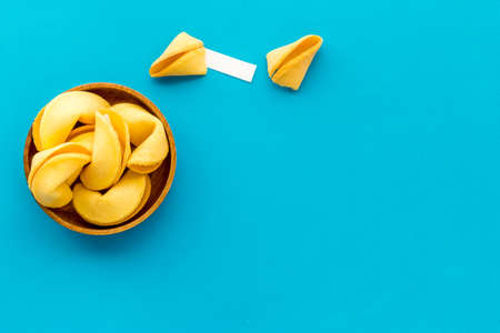 Fortune cookie on a blue background and place for text. mockup. Blank paper for writing a fortune