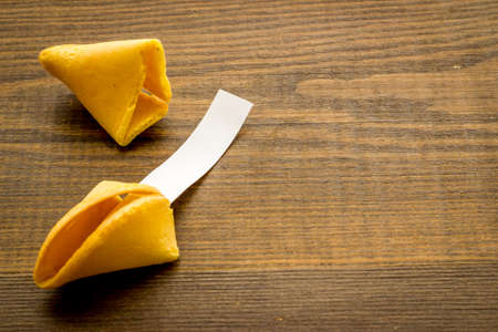 Cracked fortune cookies with blank paper on the wooden table