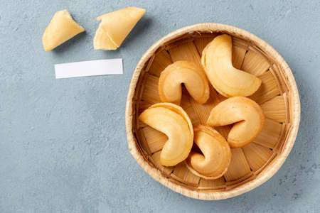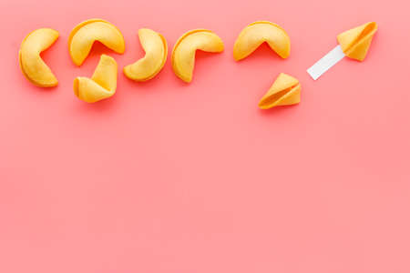 Chinese New Year fortune cookies flat lay with empty space for text. Top view