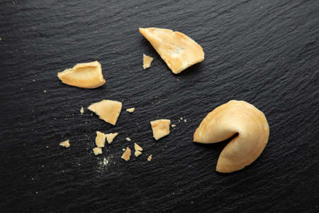 Fortune cookies, one cookie is cracked. Top view