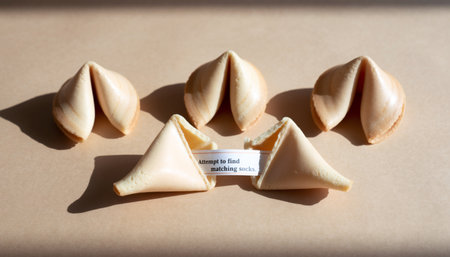 Five fortune cookies arranged on beige surface, one broken open displaying witty fortune slip. Clean minimalist styling with natural lighting creates elegant commercial appeal.