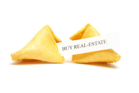 A cracked open fortune cookie stating to buy real estate.
