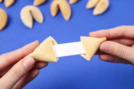 Fortune cookies with blank slip on blue background