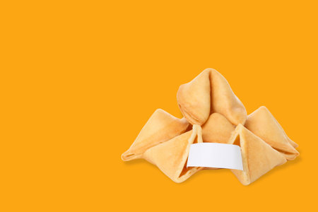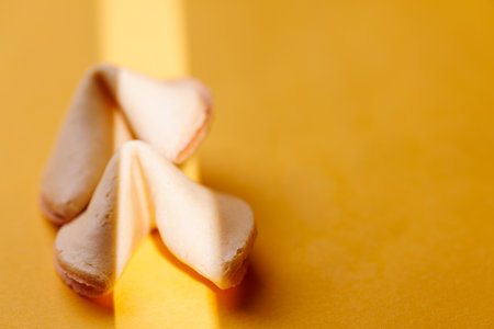 Authentic fortune cookies on a vibrant yellow background. These crispy treats are essential for representing luck and traditional celebrations!!