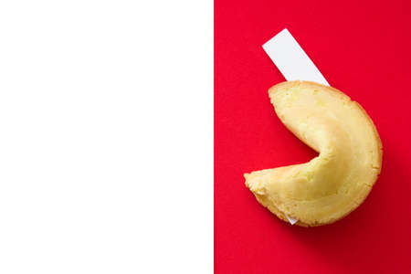 Traditional fortune cookies with white empty paper for text on red background