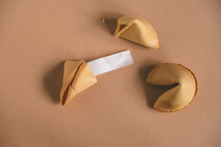 top view flat lay fortune cookie with blank space for text on a beige background