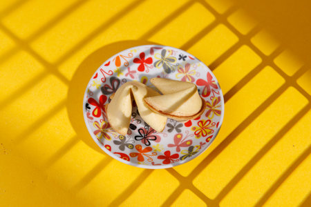 Crispy Chinese fortune cookies on a flower plate over an intense yellow background. The sharp light play creates a modern and lucky aesthetic shot!!