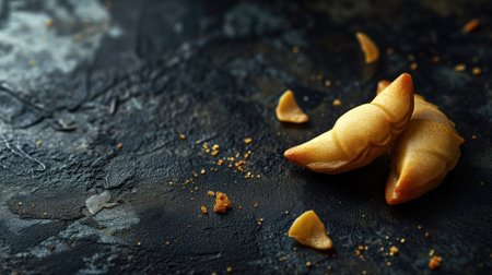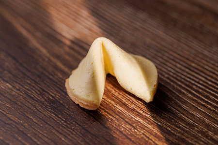 Authentic fortune cookies on a rustic wood surface. The dark background emphasizes the golden color of these traditional luck symbols and snacks!!