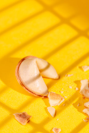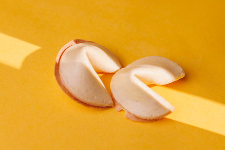 Traditional Chinese fortune cookies on a bright yellow surface. The sharp light play highlights the texture of these iconic snacks for marketing!!