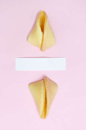 Fortune cookies on a pink background and place for text. Mockup. Blank paper for writing a fortune. Vertical.