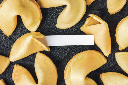 Fortune cookie with blank slip background on black table top-down