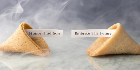 Illustration 13 Two fortune cookies p symmetrically with the phrase Honor Tradition Embrace the Future showing on the paper of the od cookie set against a misty background..