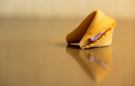 Single Fortune Cookie Reflects In Glossy Table Top with copy space to left