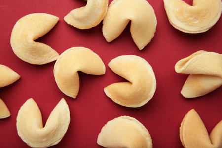 Traditional fortune cookies on red background. top view
