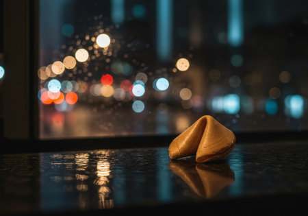 A mystical fortune cookie floats in the rain during a mysterious evening