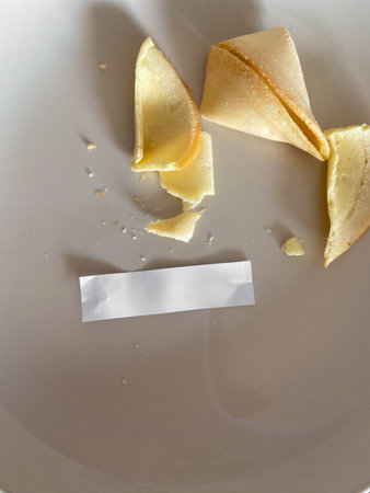 Broken fortune cookies with blank paper strip on plate. Choice aftermath, uncertainty, randomness and symbolic moment of decision