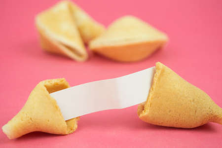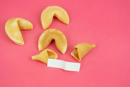 Fortune Cookie on a crimson background. Close-up of foreboding broken cookies with white paper with copy space on a dark pink background