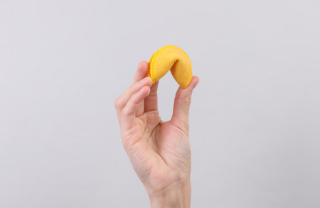 Fortune cookie in hand on gray background