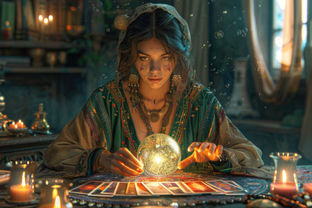 A woman with long dark hair and jewelry adorns her neck and wrists, gazes intently into a crystal ball. Surrounded by candles and a colorful rug, she embodies a mystical and spiritual atmosphere.