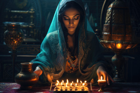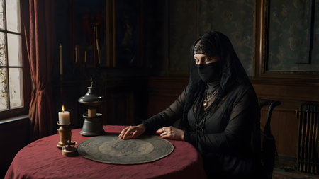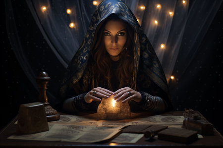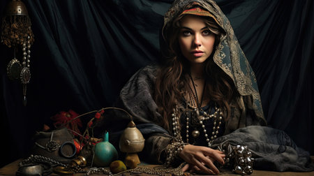 Mystic oracle woman practices ancient divination, peering into the mystical unknown, deciphering the secrets of fate.