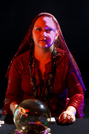 Magnificent fortune teller woman reading future on magical crystal ball.