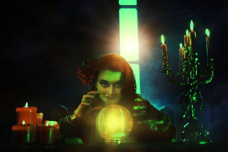 The witch predicts the future. Black magic. Mystical interior of the room.