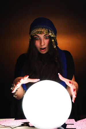 Beautiful young long hair woman fortune teller predict the future with crystal ball.