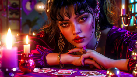 Sorceress telling fortunes using cards and candles