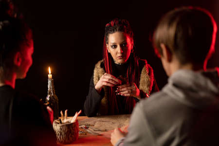 Fortune teller forecasting the future to woman with cards