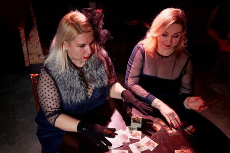 Two fat women with playing cards in a dark room with red light. Photo shoot in gangsters style