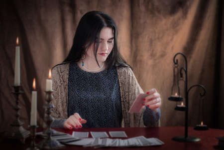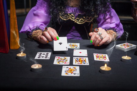 Close up of sorceress telling fortunes using cards and candles
