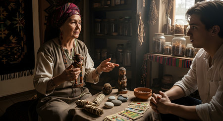 An elderly woman, appearing as a shaman or herbalist, sits with a young man in a rustic room. She holds a small wooden doll and gestures while talking, with tarot cards, stones, and dried herbs on the table between them.