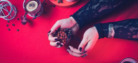 a fortune teller holds a dried Rowan tree for divination. blank for the designer. The concept of magic and occultism. Divination. Top view, tinted.