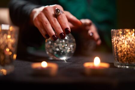 Close-up of fortuneteller divining on magic ball at table with burning candles