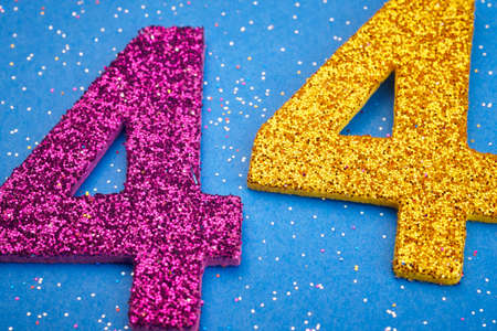 Number fortyfour purple yellow color over a blue background. Anniversary. Horizontal