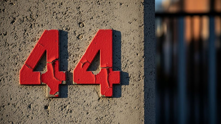The image features a close-up view of a concrete wall with a large, bold, red number 44 attached to it. The number appears slightly worn, suggesting it has been there for some time. In the background, there is a blurred view of a black metal fence, adding depth to the scene. The overall atmosphere is simple and straightforward, focusing on the prominent number.