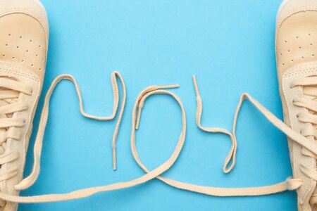 404 text from laces of sneakers on blue background.
