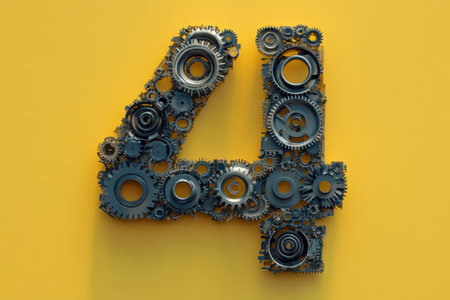 The number 4 is made up of gears and is surrounded by a yellow background. The gears are of various sizes and shapes, and they are arranged in a way that creates a sense of movement and energy