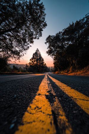 A view of a road stretching into the distance at sunset. The image displays parallel yellow lines with a blurred background. The trees frame the road on both sides. The scene is bathed in warm colors with low lighting. Suitable for editorial and commercial projects.