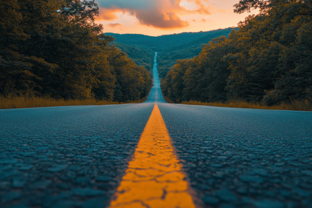 An asphalt road stretches into the distance, framed by trees under a colorful sunset. The scene displays warm colors and strong lighting. Suitable for travel, editorial, or commercial projects. The perspective is low angle with emphasis on the road markings.