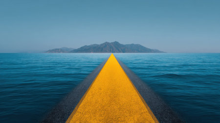 A tranquil road stretches over calm ocean waters towards a distant island, framed by serene blue skies, capturing the essence of peaceful exploration and adventure.