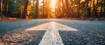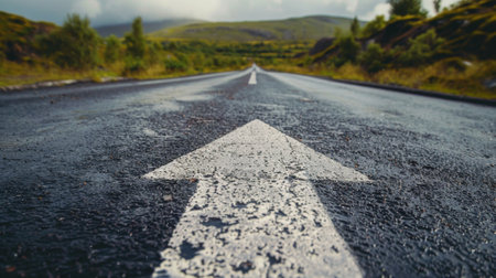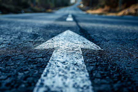 Close-up captures a white arrow marked on a weathered asphalt road, symbolizing forward movement. The arrow's texture contrasts with the pavement, emphasizing direction.