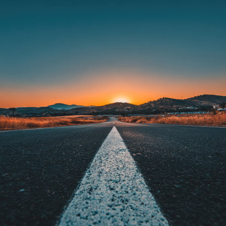 An asphalt road extends towards the horizon, framed by a vibrant sunset. The composition features a central perspective, with a white line guiding the eye. The colors include shades of blue, orange, and black, suggesting a late afternoon or early evening setting. Suitable for various visual communication projects and editorial content.
