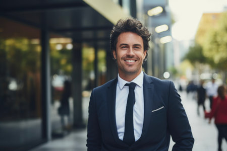 A confident man in a suit smiles while standing outside a modern building radiating positivity.