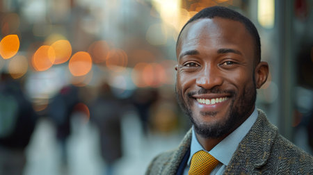 A cheerful businessman stands against a stunning sunset, surrounded by modern skyscrapers. His relaxed expression embodies confidence, creating a captivating urban portrait.