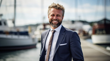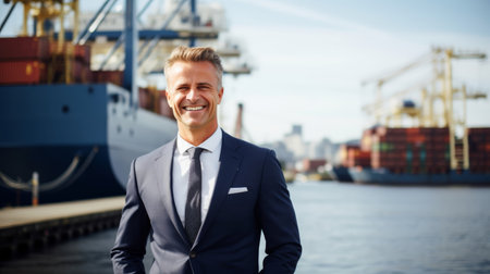 Cheerful maritime attorney overseeing harbor shipping legalities