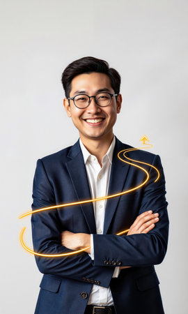 Asian male smiling with arms crossed, glowing roadmap spiraling toward future, hope and direction, isolated , photo-realistic, medium shot