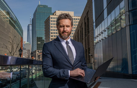 Man check report. Leadership success. Analyzing data. Businessman freelancing online. Business man working online. Remote working. Businessman leader work on laptop outdoor. Business conference