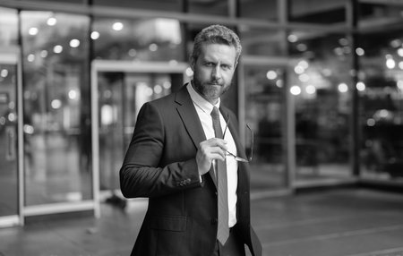 Business vision and success. Vision of success. Successful leader businessman. Business man holding glasses. Man has vision to success. Concentrating on new opportunity. Businessman leadership